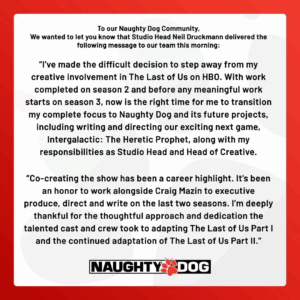 El creativo aseguró que su decisión no fue fácil, pero que es el momento ideal para concentrarse en lo que viene: la escritura y dirección de un nuevo videojuego original titulado Intergalactic: The Heretic Prophet, el cual marcaría un giro importante en la narrativa de Naughty Dog hacia la ciencia ficción. A esto se suman sus responsabilidades continuas como director del estudio y líder del equipo creativo.